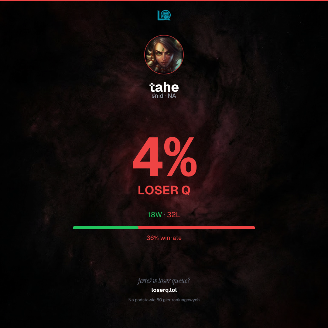 18 zwycięstw, 32 porażek — winrate 36%. Ciężki okres.