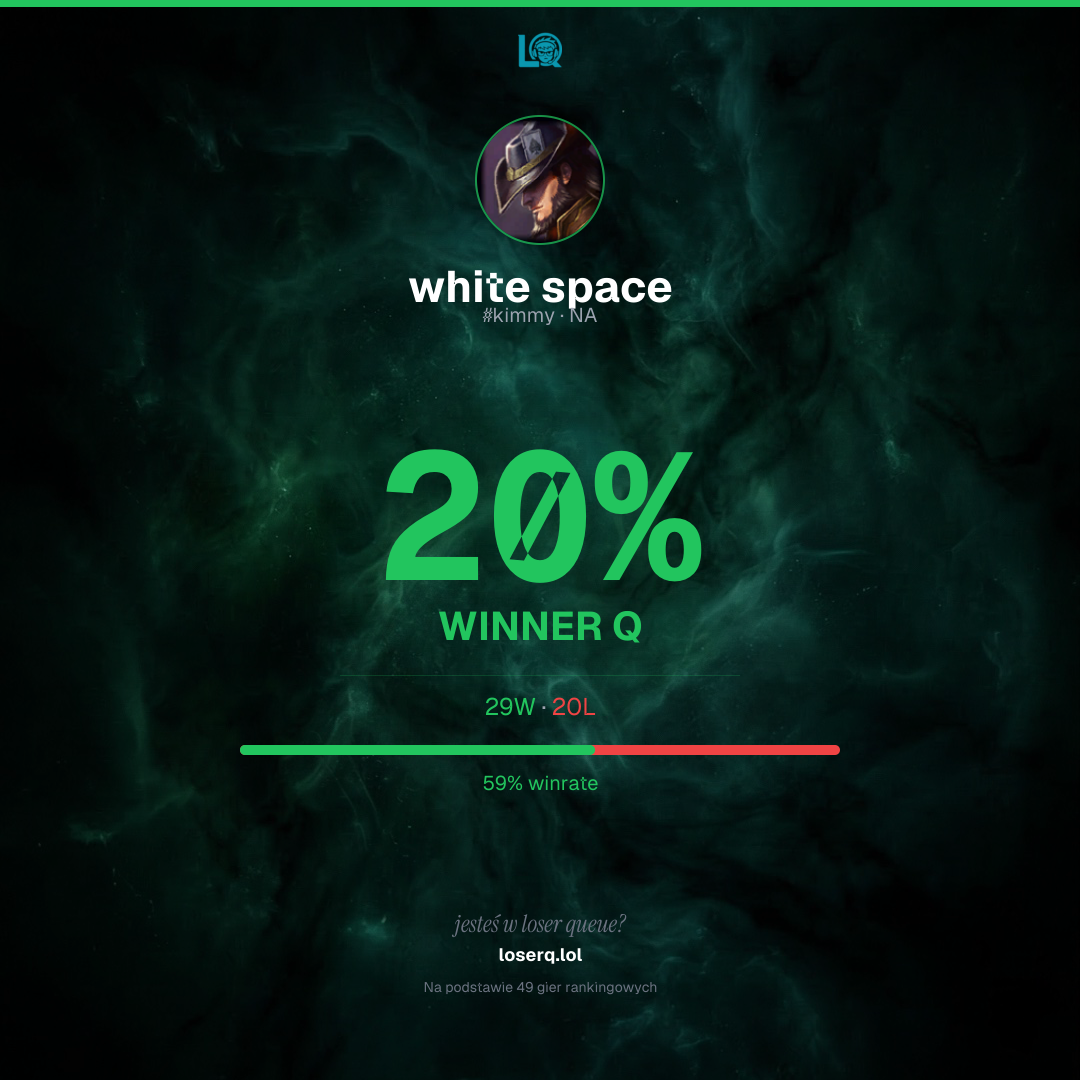 29 zwycięstw, 20 porażek — winrate 59%. Mocny wynik.