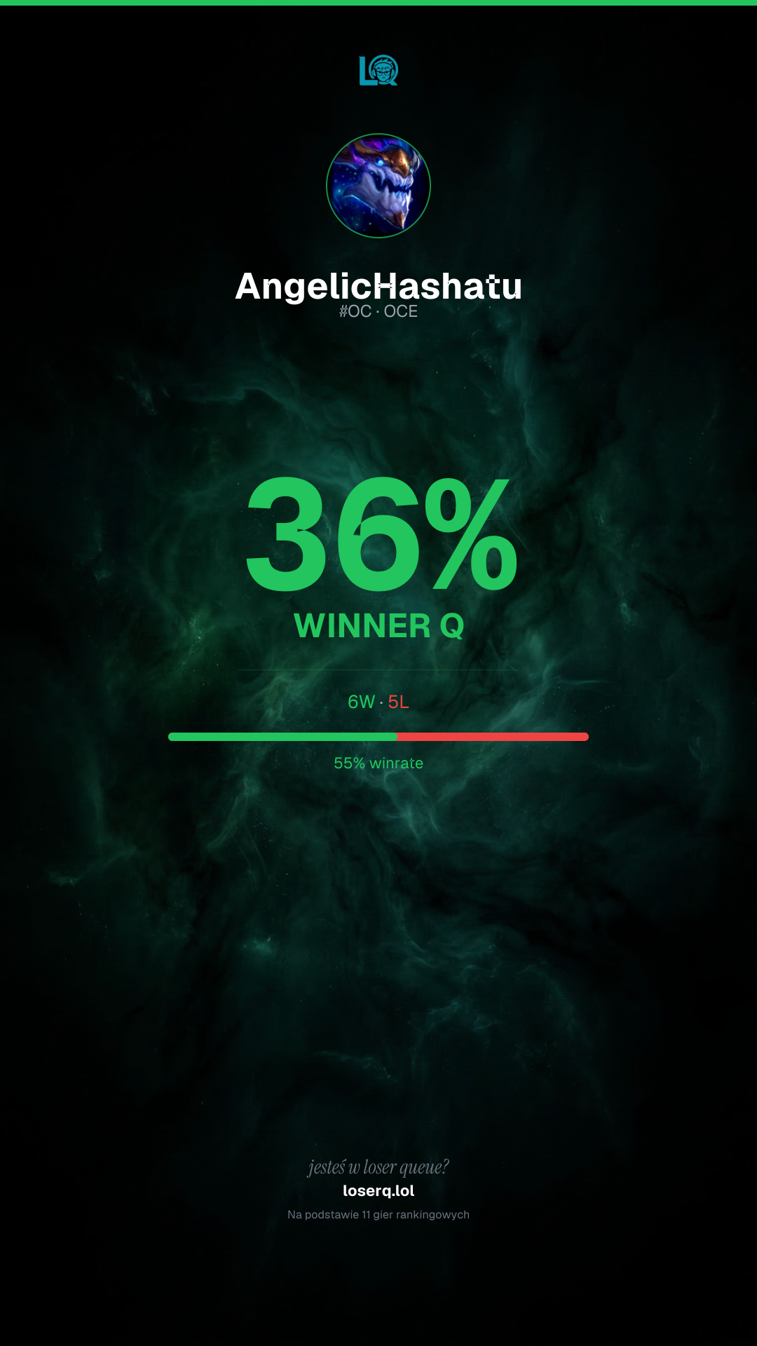 6 zwycięstw, 5 porażek — winrate 54%.