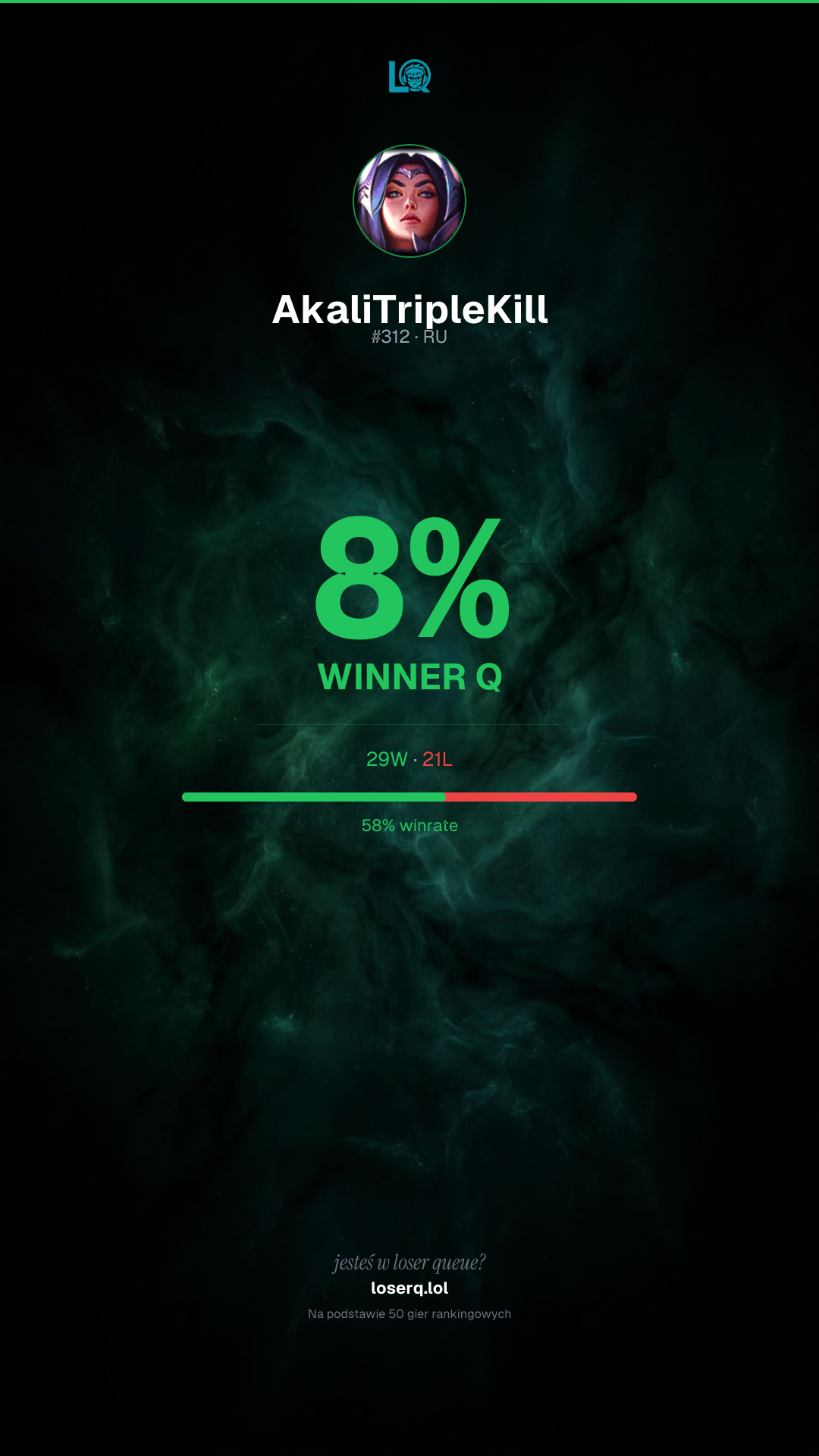 29 zwycięstw, 21 porażek — winrate 58%. Mocny wynik.