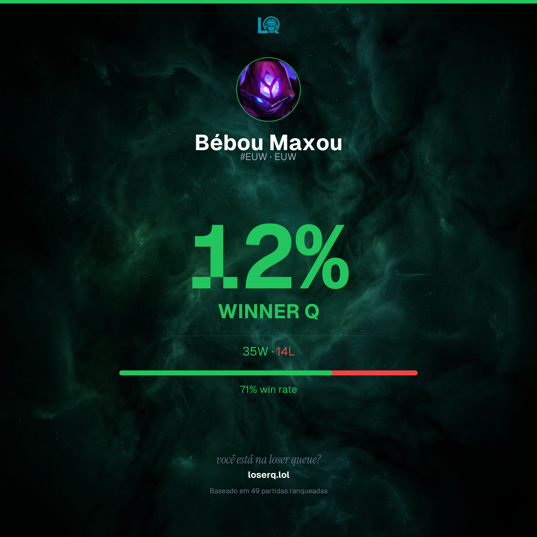 35 vitórias, 14 derrotas — 71% de win rate. Um bom desempenho.