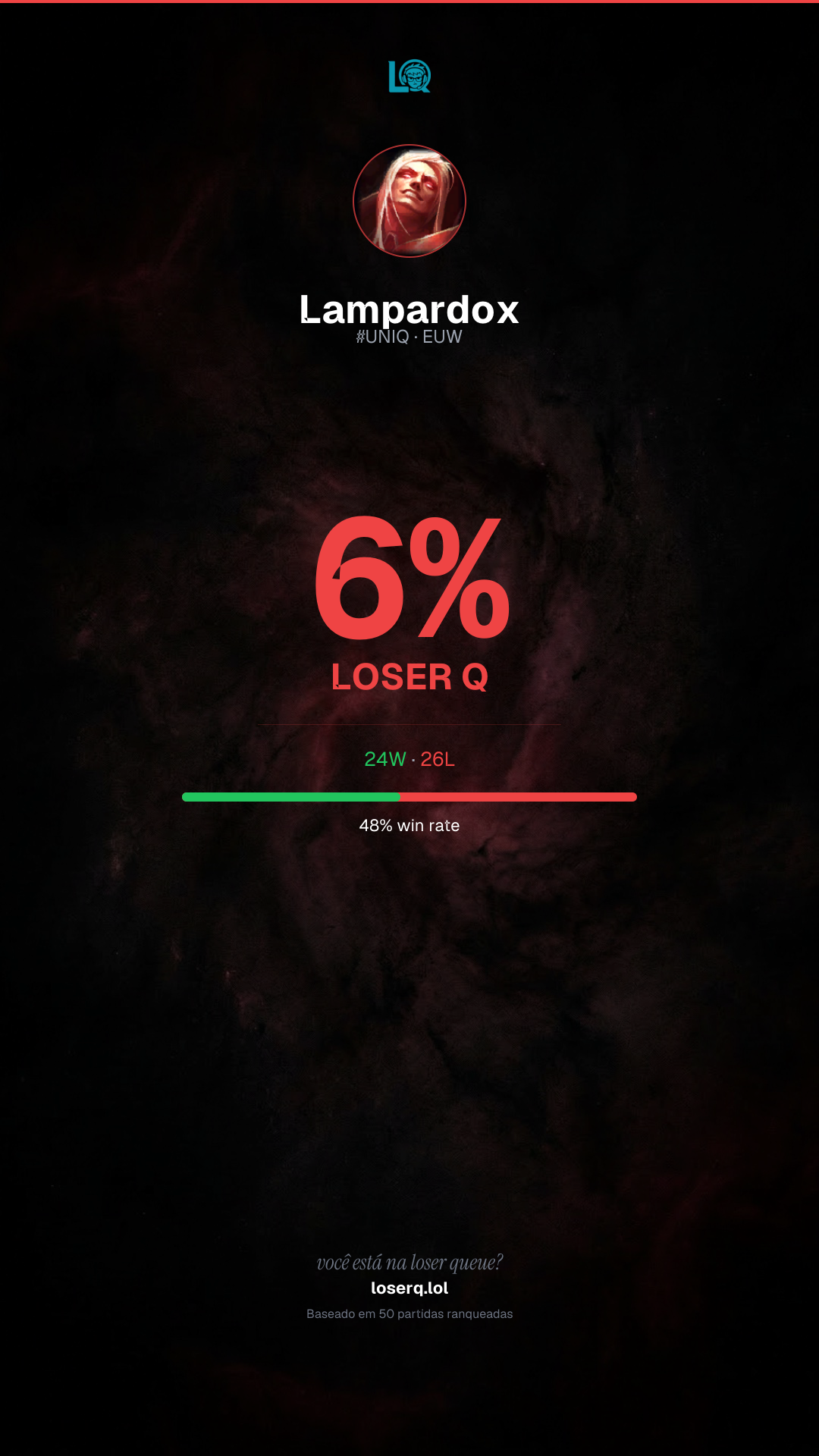 24 vitórias, 26 derrotas — 48% de win rate.