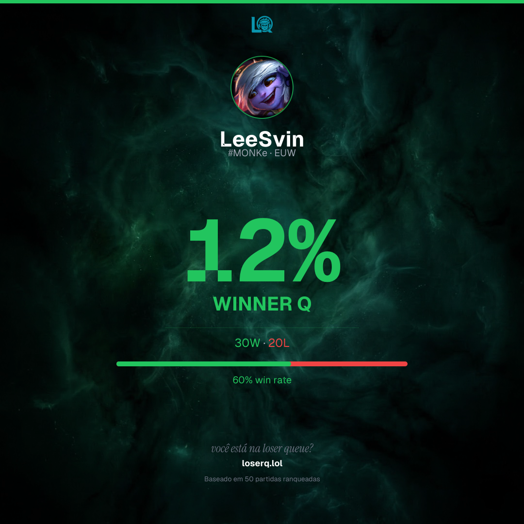 30 vitórias, 20 derrotas — 60% de win rate. Um bom desempenho.