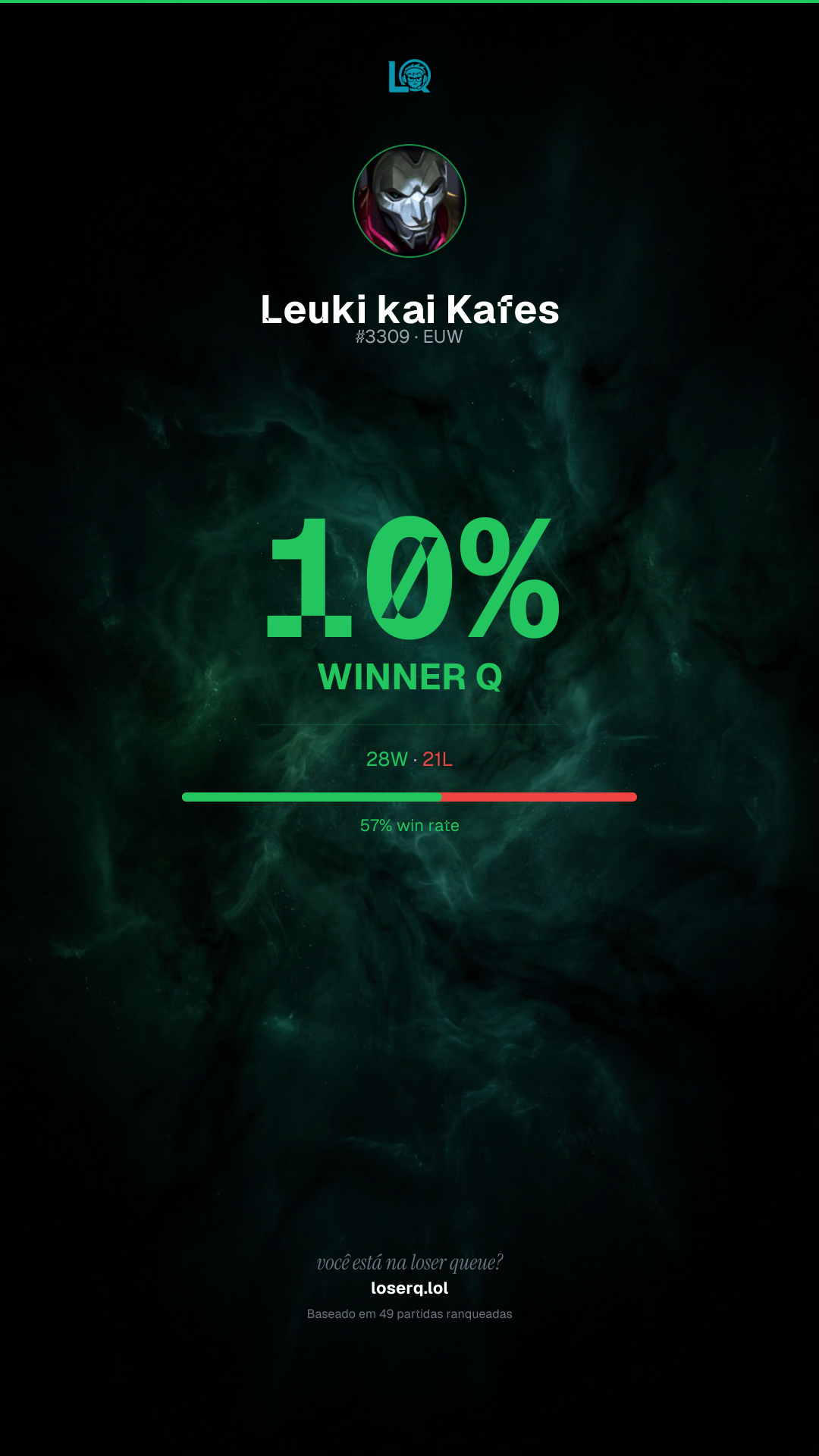 28 vitórias, 21 derrotas — 57% de win rate. Um bom desempenho.