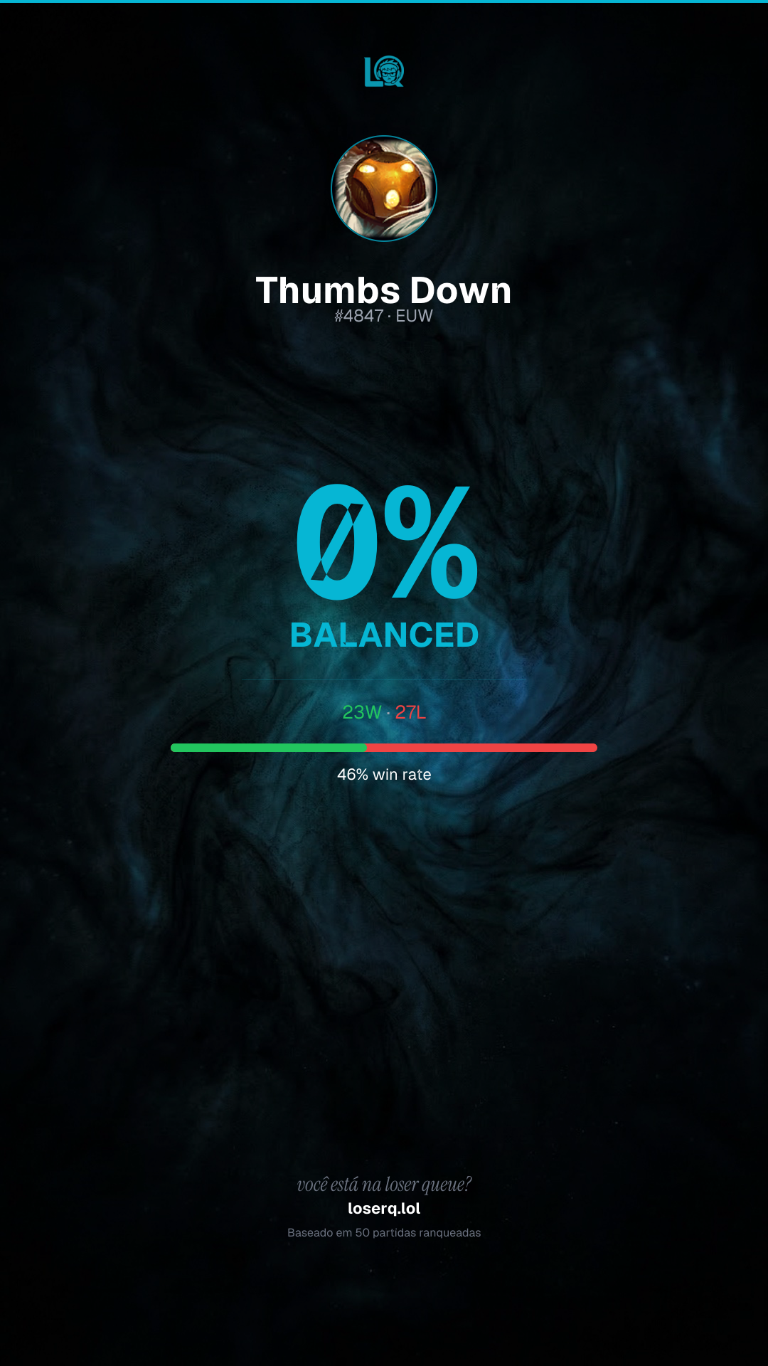 23 vitórias, 27 derrotas — 46% de win rate.
