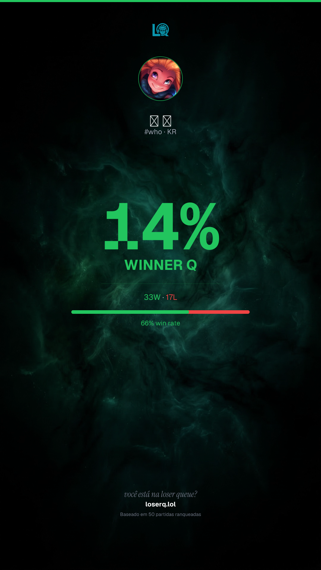 33 vitórias, 17 derrotas — 66% de win rate. Um bom desempenho.