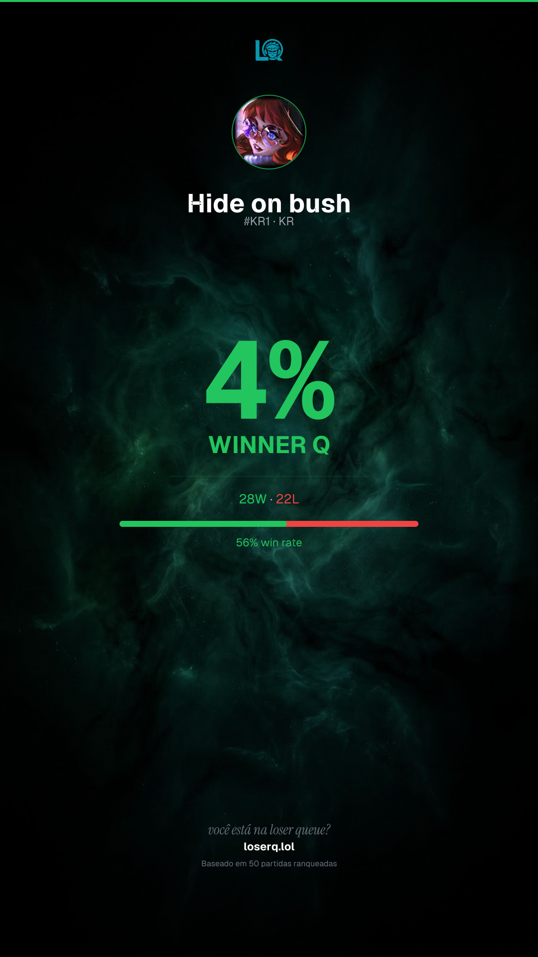 28 vitórias, 22 derrotas — 56% de win rate. Um bom desempenho.