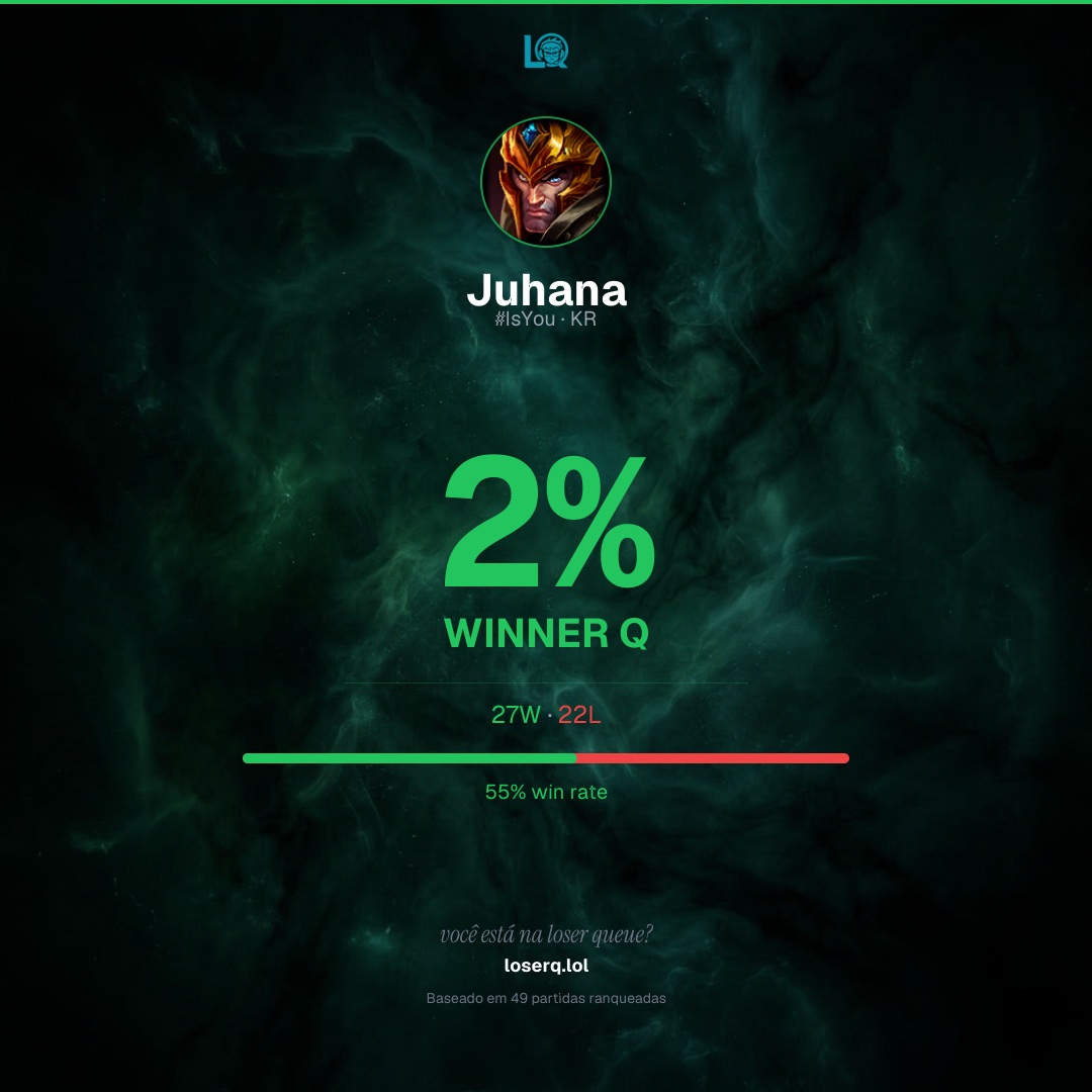 27 vitórias, 22 derrotas — 55% de win rate. Um bom desempenho.