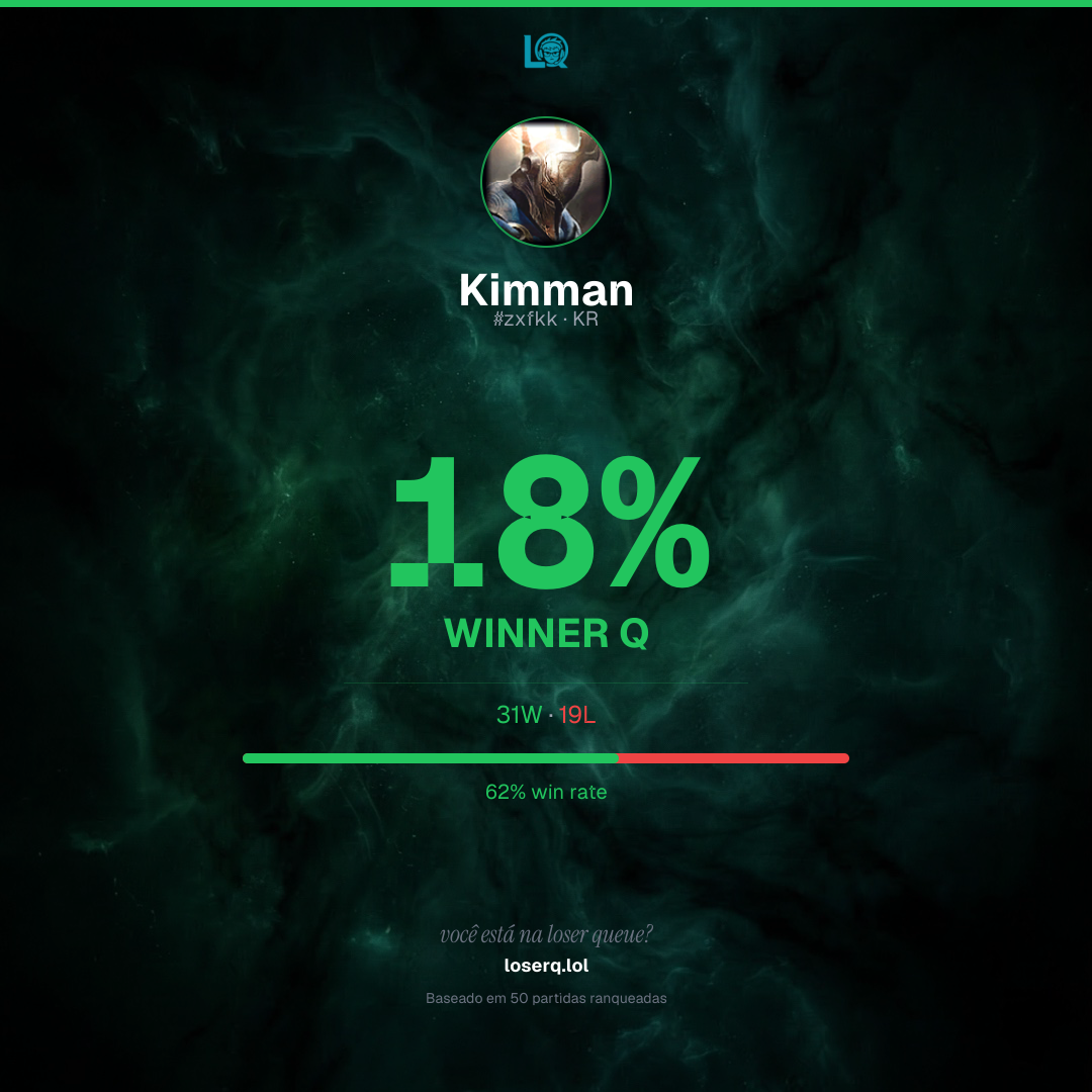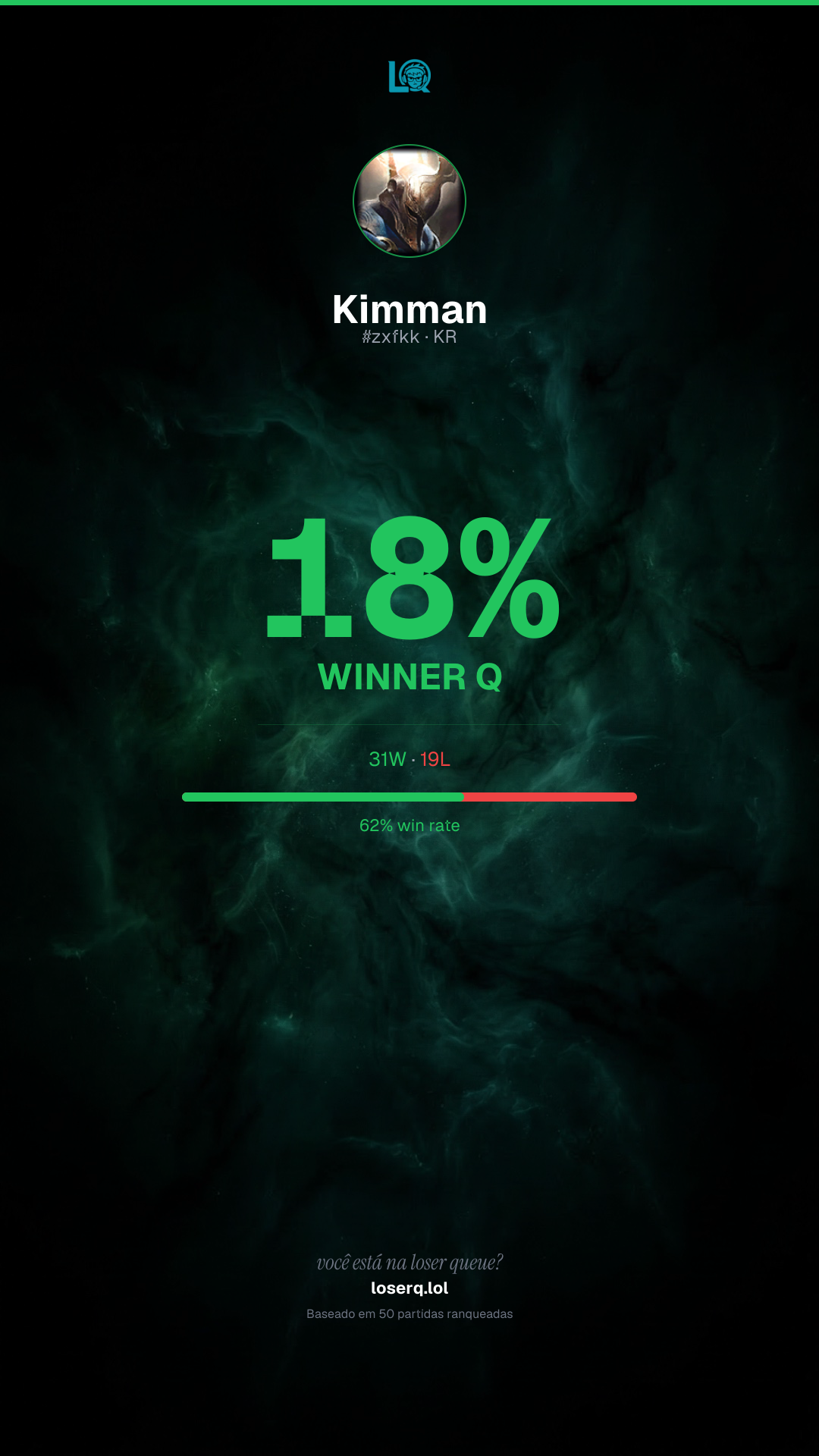 31 vitórias, 19 derrotas — 62% de win rate. Um bom desempenho.