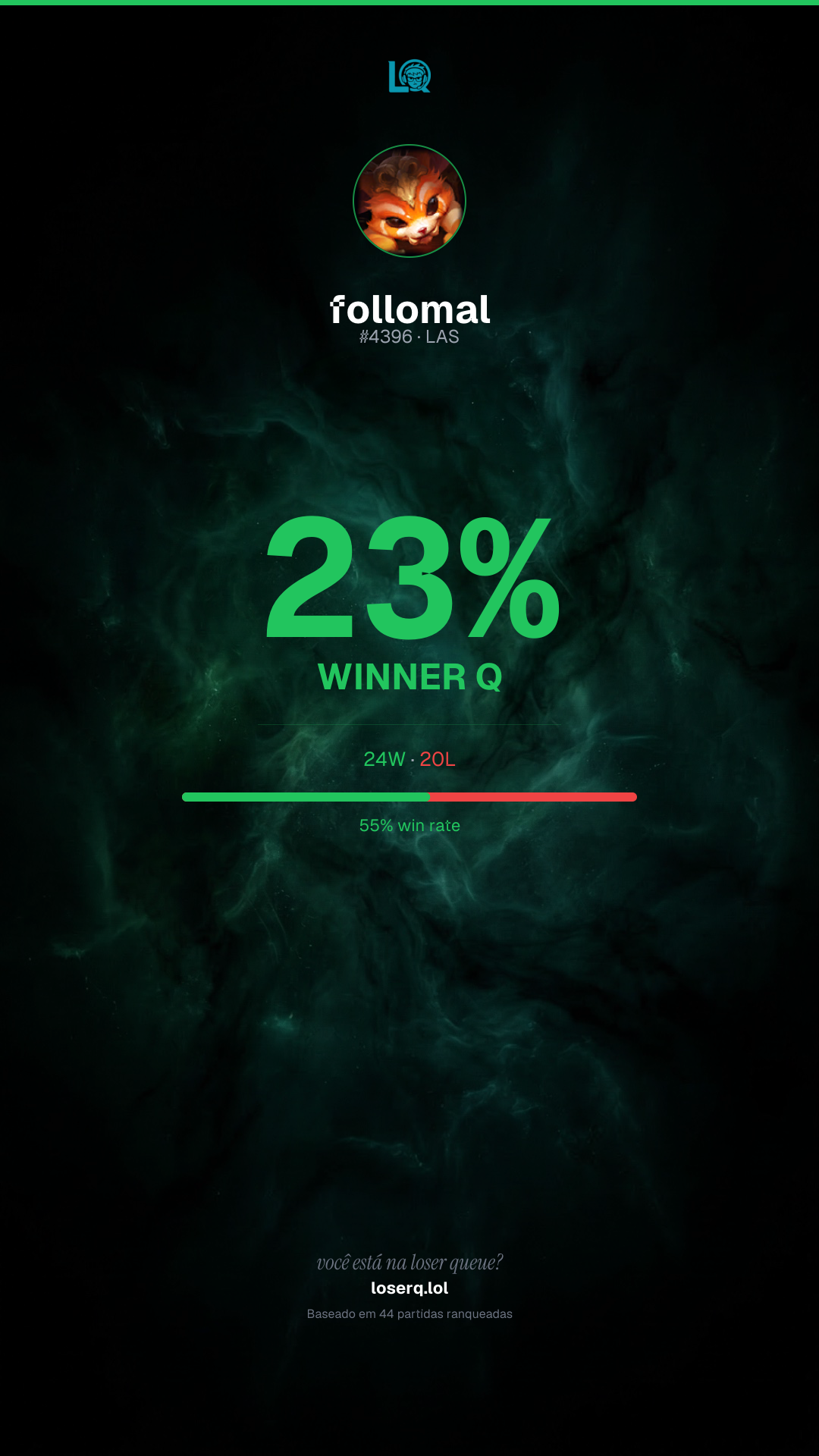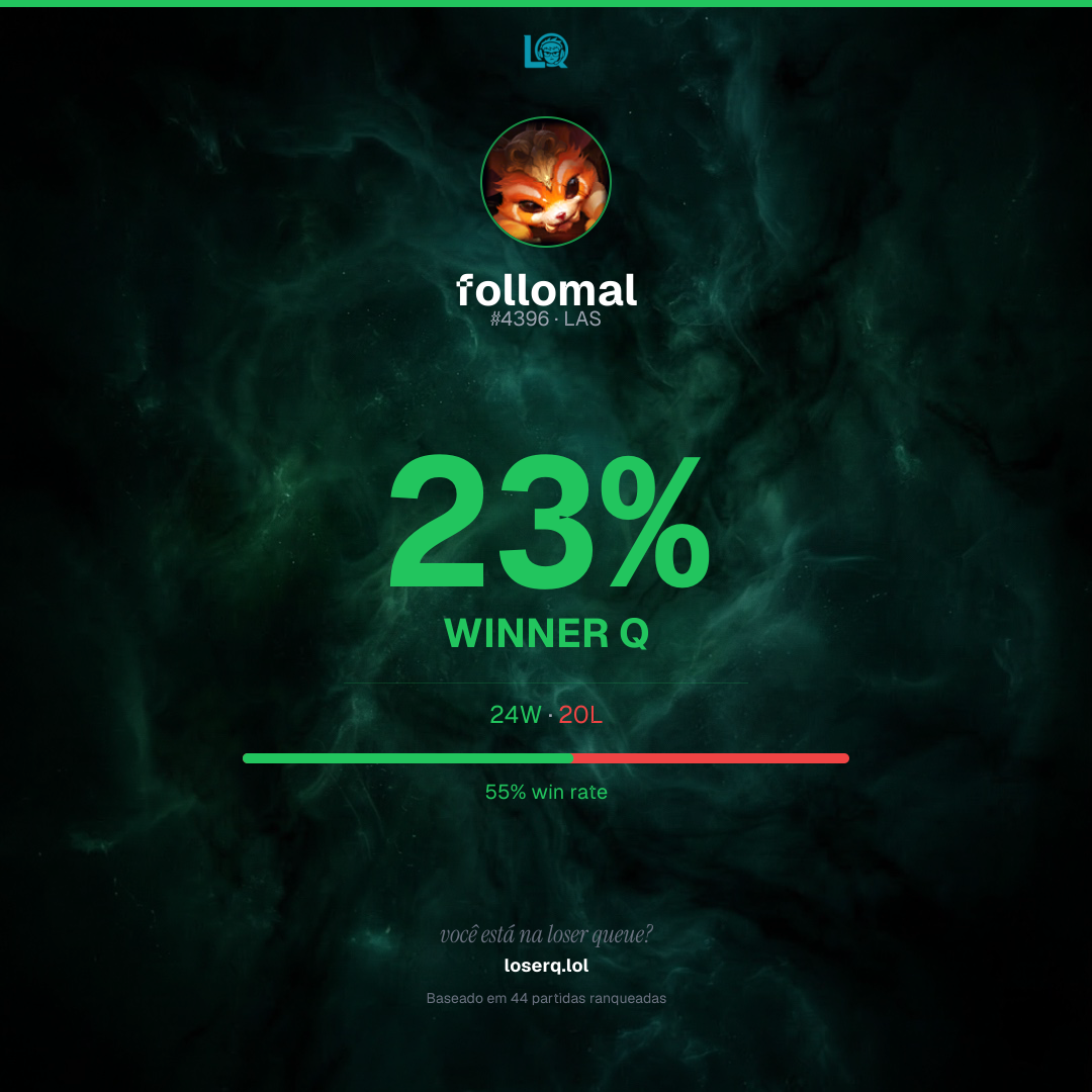 24 vitórias, 20 derrotas — 54% de win rate.