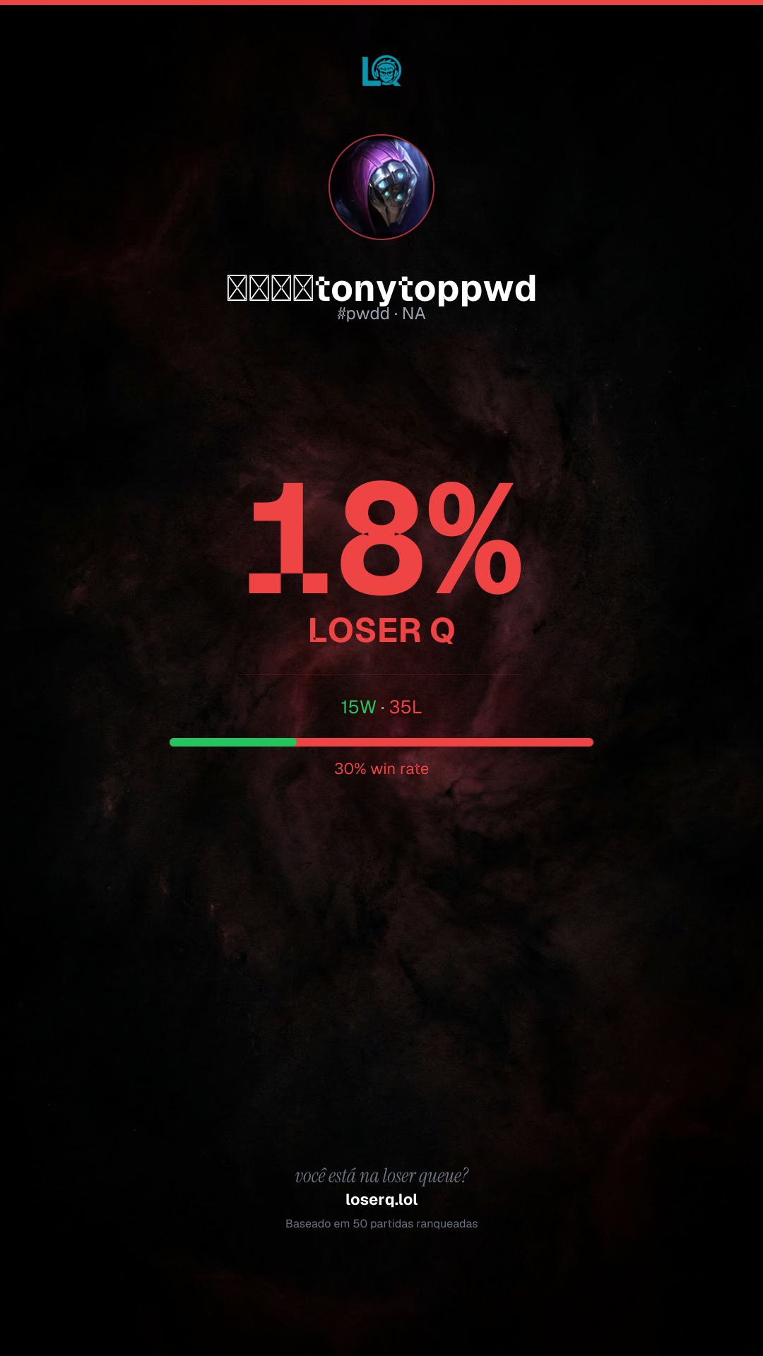 15 vitórias, 35 derrotas — 30% de win rate. Fase difícil.