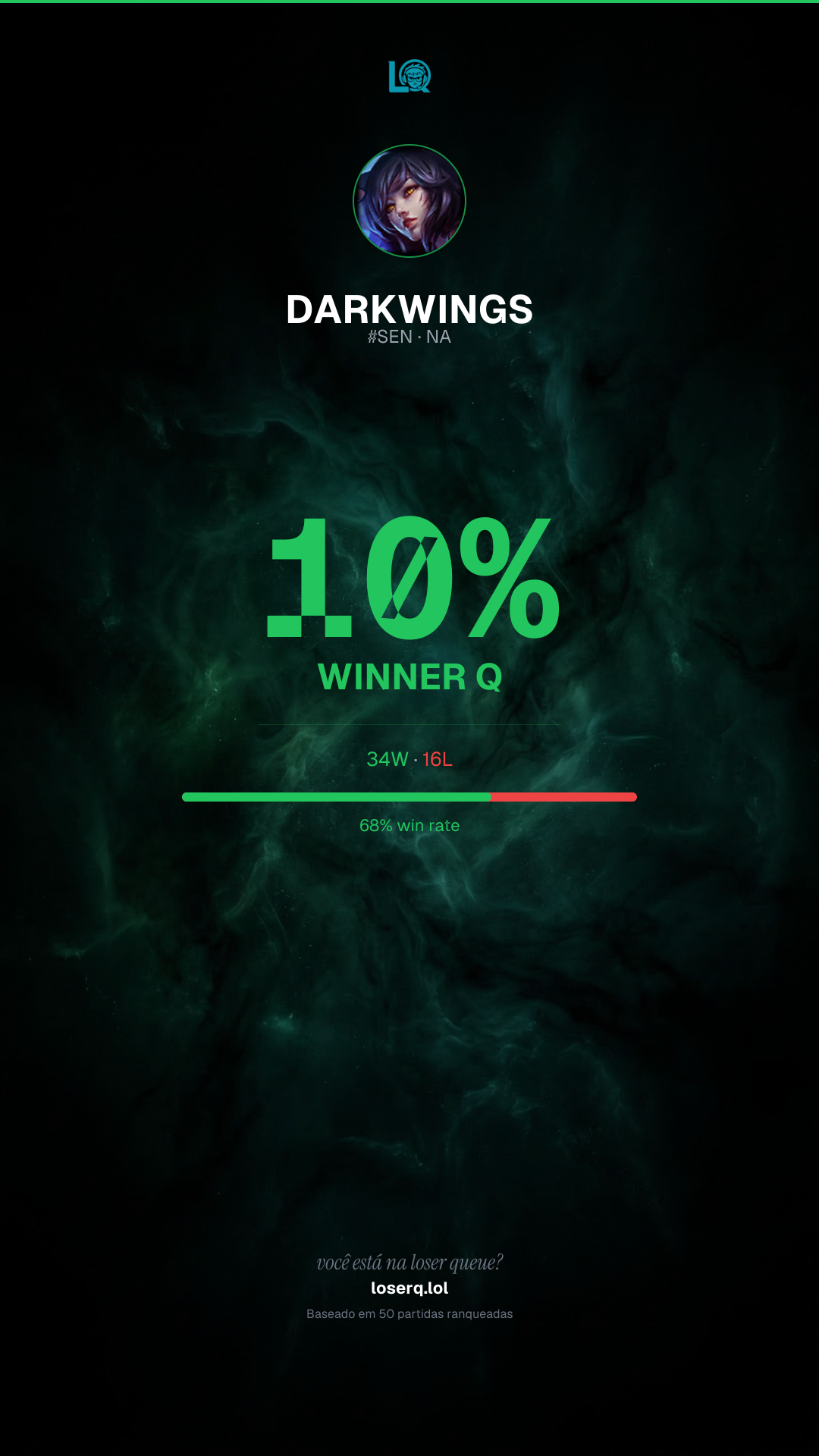 34 vitórias, 16 derrotas — 68% de win rate. Um bom desempenho.