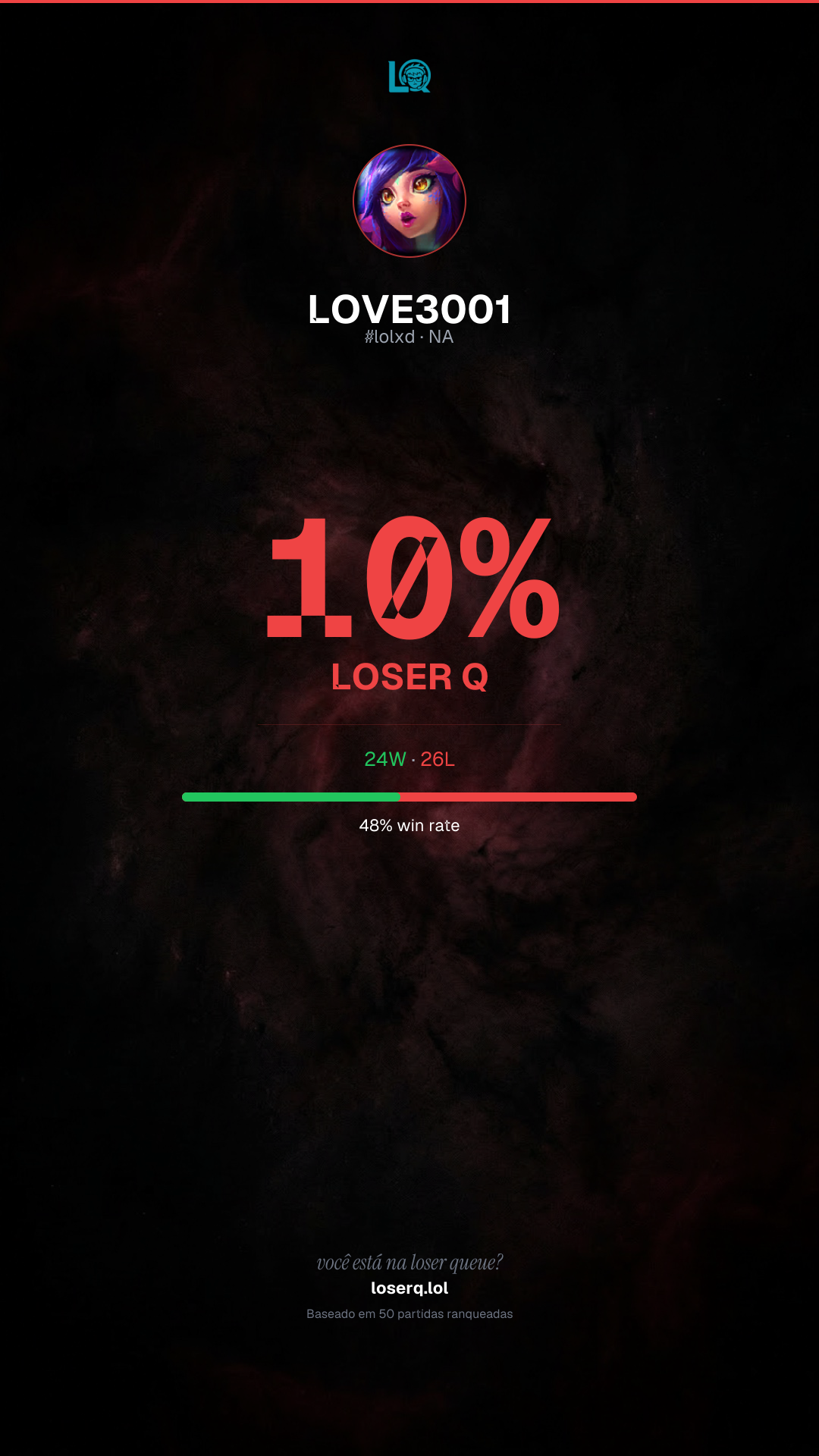 24 vitórias, 26 derrotas — 48% de win rate.