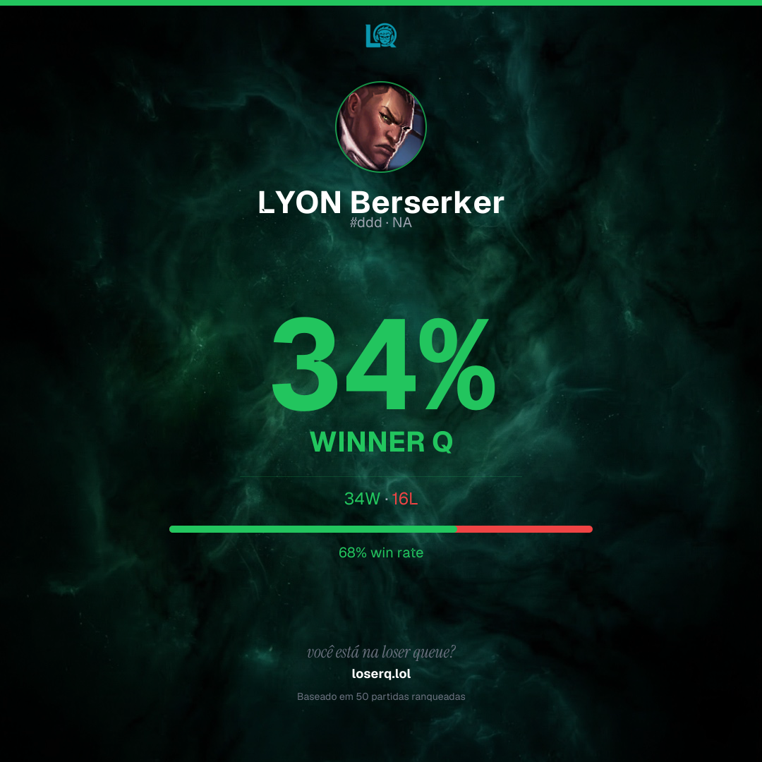 34 vitórias, 16 derrotas — 68% de win rate. Um bom desempenho.