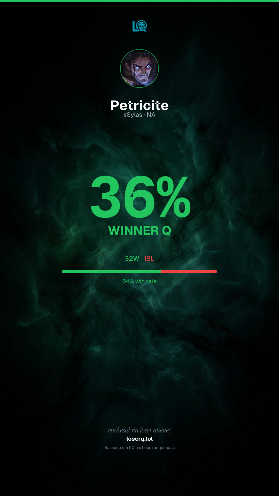 32 vitórias, 18 derrotas — 64% de win rate. Um bom desempenho.