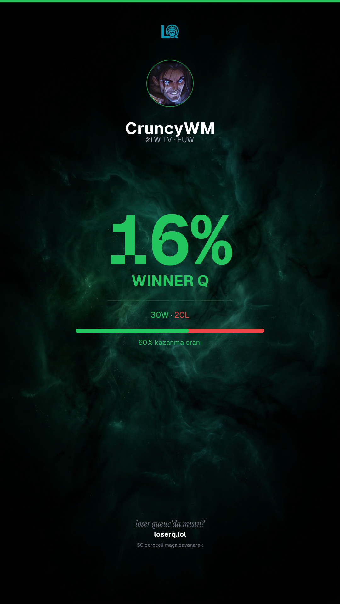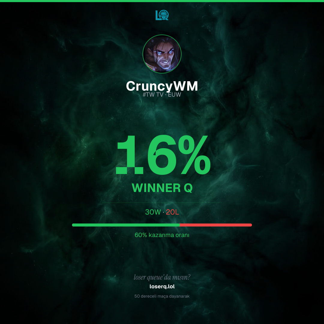 30 galibiyet, 20 mağlubiyet — 60% kazanma oranı. Güçlü bir performans.