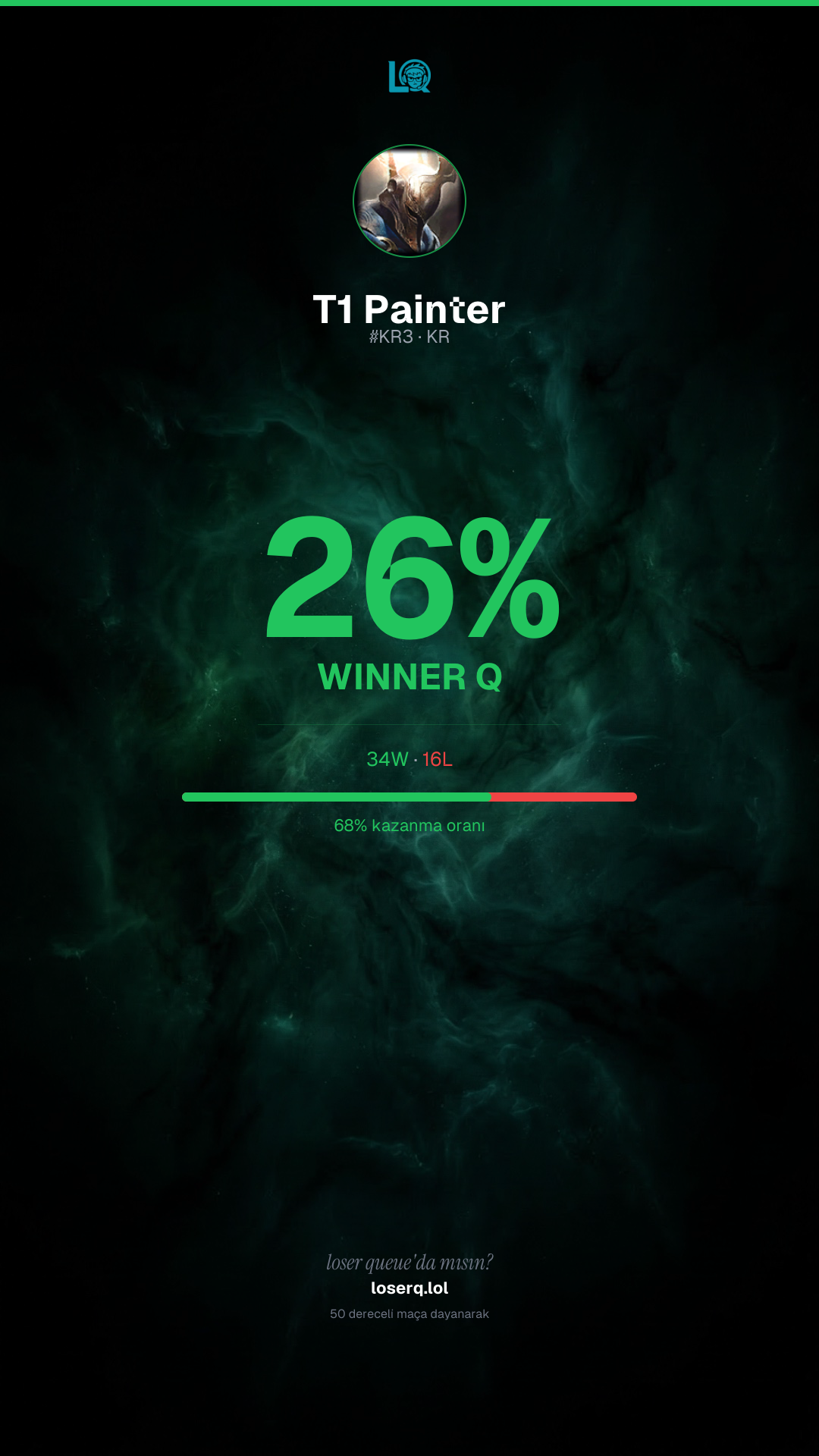 34 galibiyet, 16 mağlubiyet — 68% kazanma oranı. Güçlü bir performans.